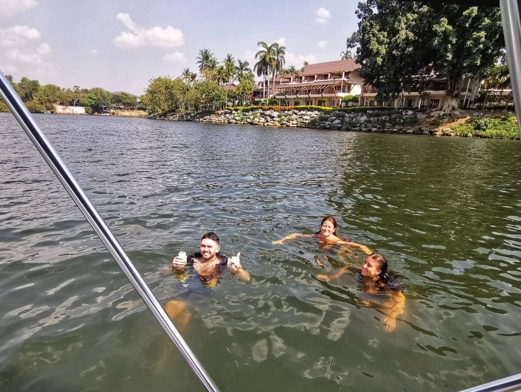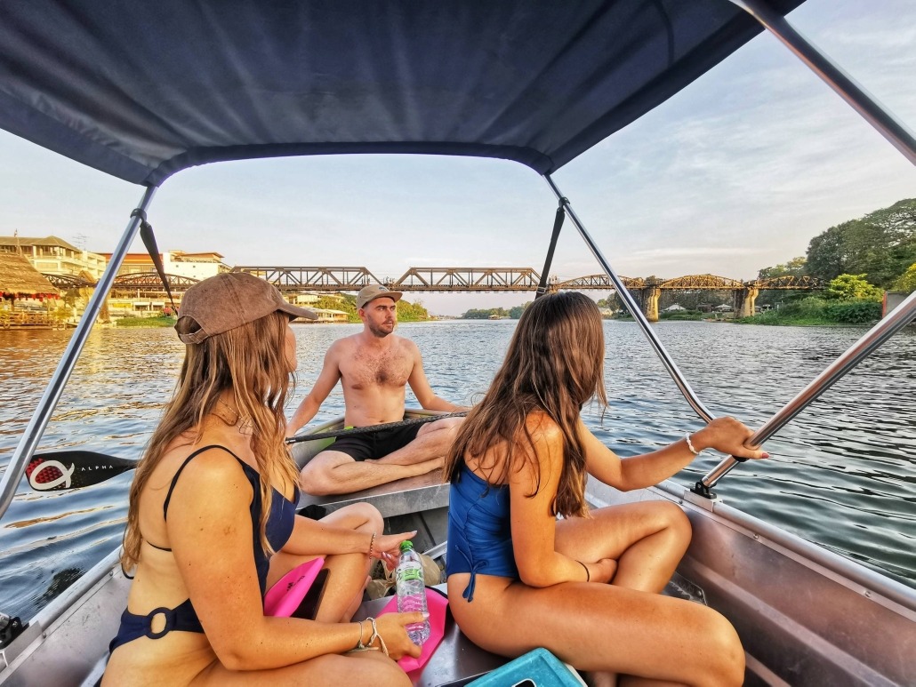 Off-the-Beaten-Track on a 3 hour adventure along the River Kwai. Splash in the water, float around, jump off the boat for fun, try a bit of fishing, and just relax while nature does its thing. As the day winds down, watch the sunset paint the river gold. See the famous Bridge on the River Kwai from a totally new angle — right from the water — far away from the busy spots in Kanchanaburi. Enjoy a relaxing experience with no crowds, no rush, just smiles, water, and good vibes. Small Group = Big Experience — peaceful, private, and never crowded.